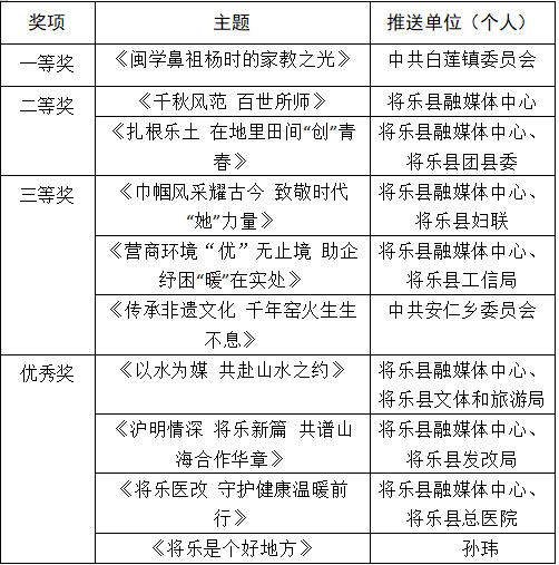 根據《中共將樂縣委宣傳部關于做好2025年全縣理論宣講工作的通知》(將委宣〔2025〕4號)文件精神,將樂縣委宣傳部(文明辦)、將樂縣社會科學界聯合會、將樂縣融媒體中心在“微將樂”微信公眾號聯合發起“樂說·樂有理”欄目2025年優秀宣講微視頻征集活動,于2025年10月1日圓滿結束。本次征集活動共收到47 部作品,經過海選初篩、專家評審等環節,評選出優秀微視頻一等獎1名、二等獎2名、三等獎3名,優秀獎4名,現予以公示(具體名單如下)。